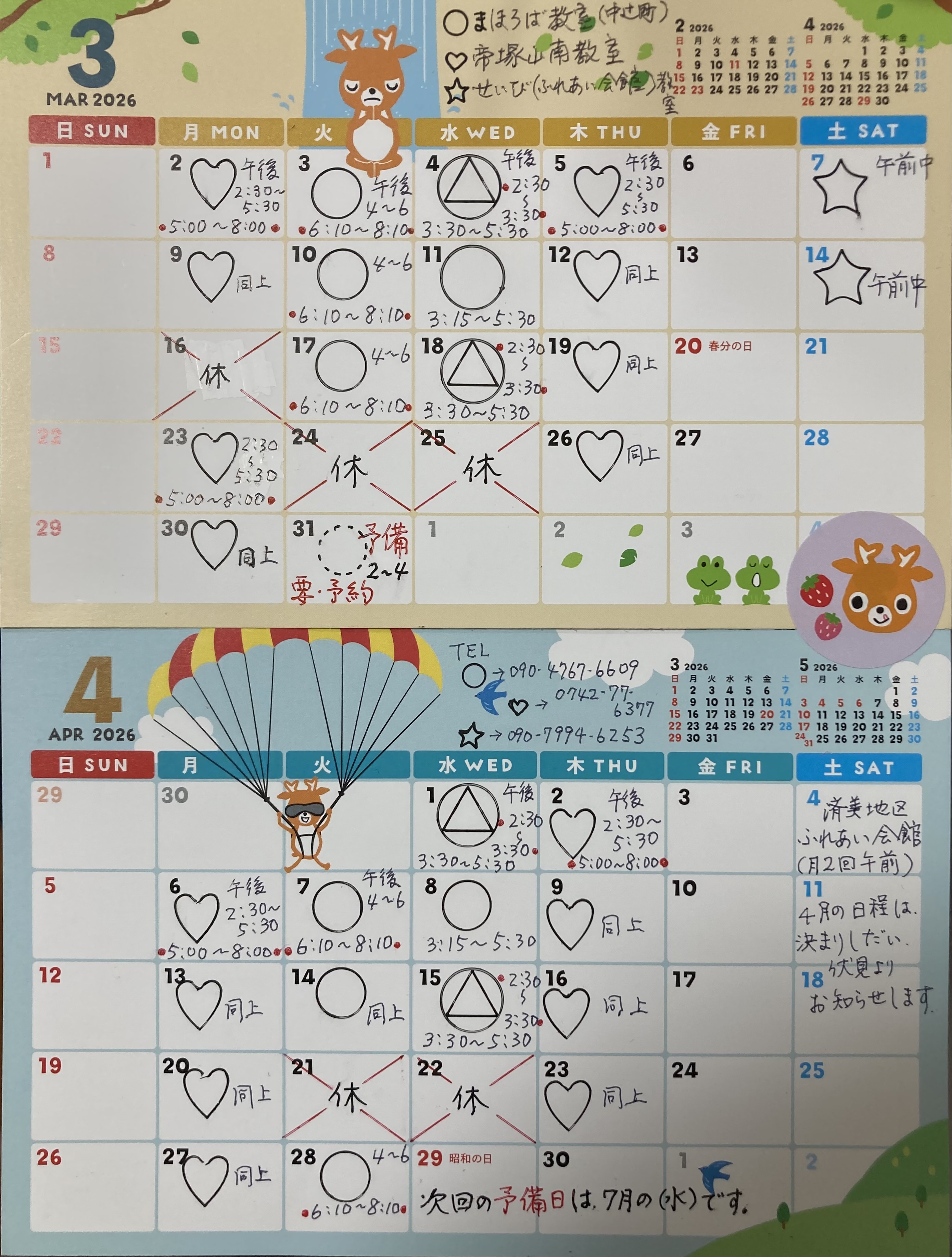 まほろば教室=火.水の○印の全て(そのうち🔴印=火曜日18:10~20:10大人。△水曜日14:30~15:30大人。)/済美地区ふれあい会館=☆土曜日(月2回、担当:伏見)/帝塚山南教室=♡月.木(担当:青木)