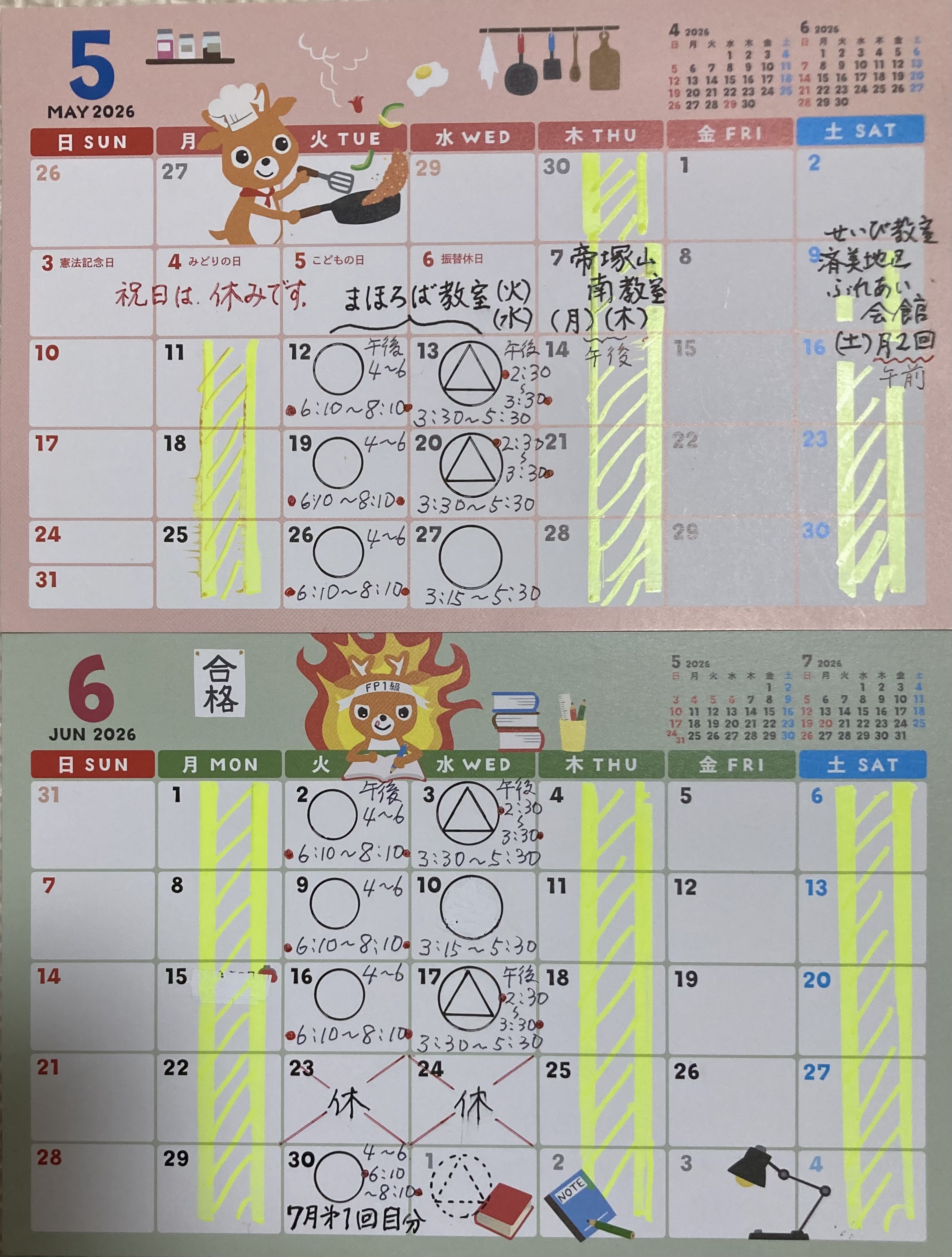 まほろば(自宅)教室=火.水の○印の全て(そのうち🔴印=火曜日18:10~20:10大人、△水曜日14:30~15:30大人。他は子供。